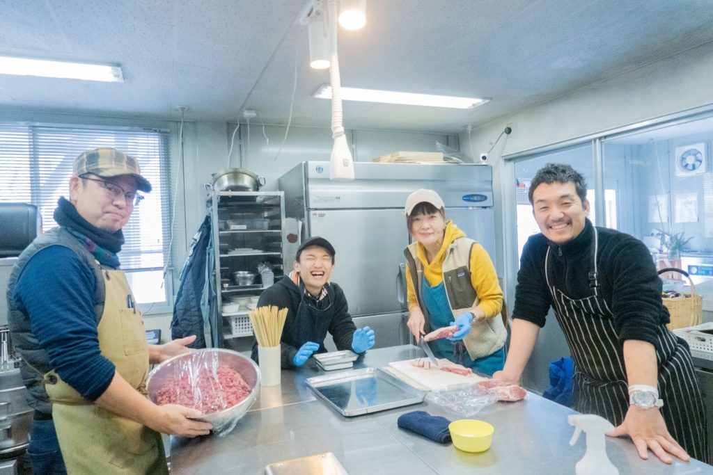 雪が落ち着いてからは、加工場での仕込み作業を体験しました。キッチンカーを出店する際に販売するハンバーガーのパテを作ったり、お肉を串に刺して串焼きの準備をしたり、オンラインストアや店舗で売ってる猪ジャーキーの肉の加工や袋詰めも手伝ったりしました。